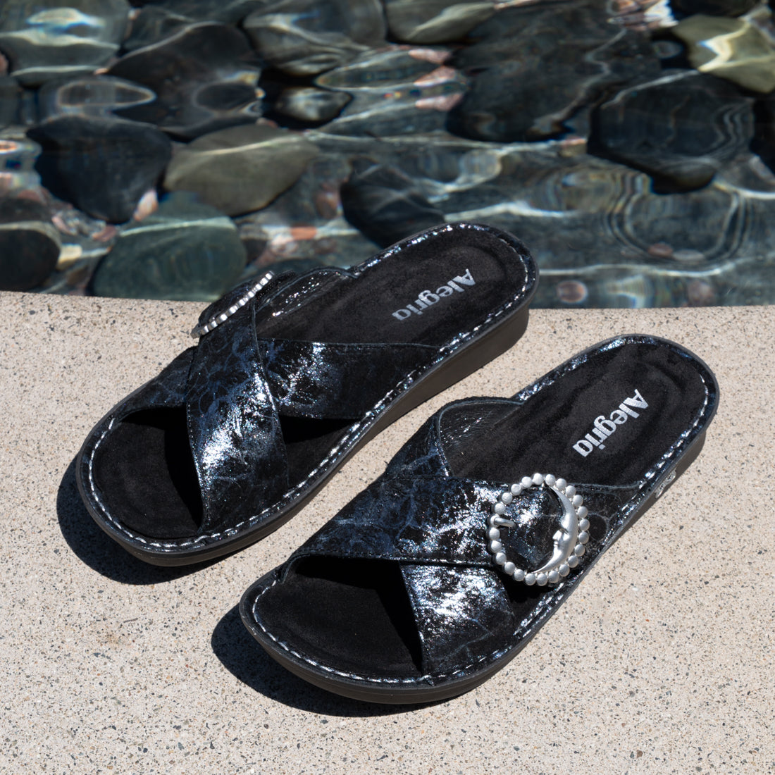 The classic crisscross sandal takes a bold step forward in this handstitched version with an ornamental buckle set on an adjustable hook-and-loop strap. A removable contoured footbed made of cork and memory foam, seamlessly fit into a mini outsole for walking ease. For added versatility, choose from uppers in textured calf hair or smooth leather.